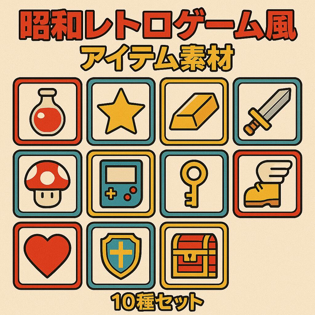 昭和レトロなゲームをイメージしたドット絵風アイテム素材セットです。